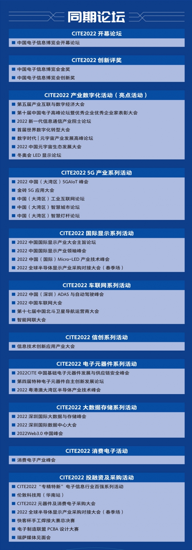 2022年4月9日-11日,第十屆中國電子信息博覽會(huì)在深圳會(huì)展中心舉辦,今年博覽會(huì)將吸引近2000家國內(nèi)外展商、展出面積超10萬平米及12萬+專業(yè)觀眾到場(chǎng)參觀。本屆博覽會(huì)集中展示包括智慧家庭、智能終端、人工智能、AGV、智能制造、高端芯片、新型顯示、AR/VR、5G和物聯(lián)網(wǎng)等代表電子信息產(chǎn)業(yè)未來發(fā)展的核心內(nèi)容。通過CITE主題館、新型顯示館、智能制造與AGV移動(dòng)機(jī)器人館、機(jī)器人及智能系統(tǒng)館、智能家居及智能硬件館、汽車電子與智能駕駛、鋰電新能源館、電子元器件九個(gè)展館等25個(gè)專業(yè)展區(qū),這除了是一場(chǎng)科技盛宴,也是一場(chǎng)行業(yè)思想盛宴,除了開幕式和五場(chǎng)高規(guī)格主論壇,大會(huì)還將圍繞產(chǎn)業(yè)數(shù)字化、5G+、高端顯示、信創(chuàng)、大數(shù)據(jù)存儲(chǔ)、車聯(lián)網(wǎng)、消費(fèi)電子、電子元器件、投融資等熱門話題,推出40余場(chǎng)重磅論壇,助推中國電子信息產(chǎn)業(yè)的蓬勃發(fā)展,具體詳情如下: