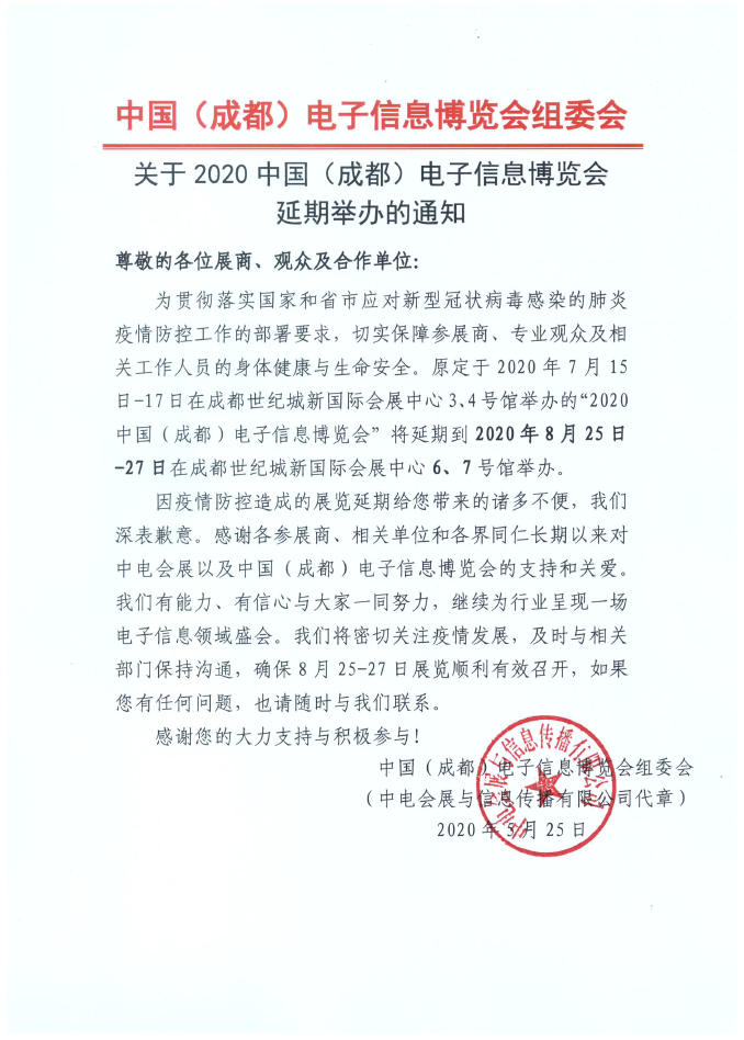 關于2020中國成都電子信息博覽會延期舉辦通知