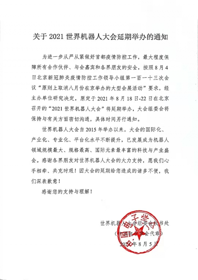 為進一步從嚴從緊做好首都疫情防控工作,最大程度保障所有合作伙伴、與會嘉賓和各界朋友的安全,按照8月4日北京新冠肺炎疫情防控工作領導小組第一百一十三次會議“原則上取消八月份在京舉辦的大型會展活動”要求,經主辦單位研究決定,原定于2021年8月18日-22日在北京召開的“2021世界機器人大會”將延期舉辦,大會組委會將保持與有關方面密切溝通,具體時間另行通知。感謝各界朋友對世界機器人大會的大力支持,愿我們心手相牽、共克時艱!因大會的延期給您造成的諸多不便,我們深表歉意!感謝您的支持與理解!