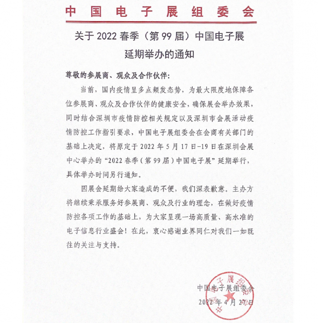 2022 春季(第99屆)中國電子展 延期舉辦的通知